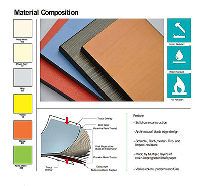 Phenolic Compact Grade Laminate is a solid, high pressure and extremely durable decorative building Panel made from layers of quality Kraft papers impregnated with Phenolic resin, incorporating a clear overlay on both decorative faces, and manufactured under high pressure and temperature.